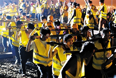 8月3日,施工人员在曹古寺线路所附近施工现场架设走行轨。 当日6点30分,经过郑州铁路局、中国通号集团公司和中铁七局1200多名施工人员连续7个小时的跨昼夜奋战,郑徐客专引入郑州东枢纽的关键连接设备6号道岔插铺完毕,这一项目完成后实现了郑徐客专与京广高铁、郑西高铁在郑州东高铁枢纽直接(不进站)互联互通,也标志我国中西部地区通往华东地区的高铁“扩容能力”显著增强,郑州承东启西,连接西北、华北地区高铁的交通枢纽地位进一步巩固。 郑徐客专是《国家中长期铁路网规划》中“四纵四横”之一的“徐兰客运专线”的重要组成部分,预计9月上旬正式通车投入运营。