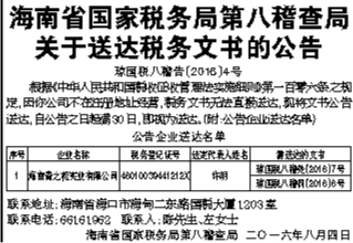 海南省国家税务局第八稽查局关于送达税务文书的公告