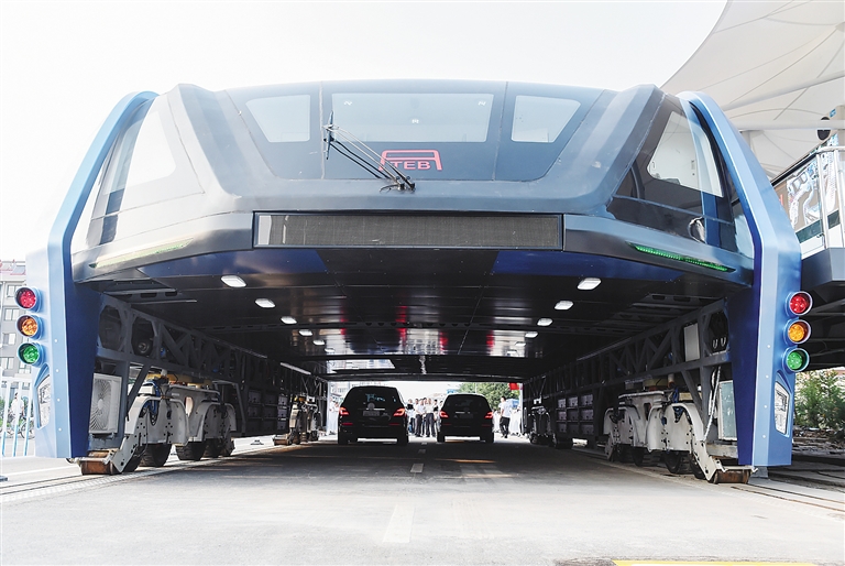 8月2日,我国自行设计研制、全面拥有自主知识产权的“空中巴士”——巴铁1号试验车,在河北秦皇岛北戴河区开始启动综合试验,包括刹车距离、摩擦系数、耗电等,检验车和路、人和车的关系。 据巴铁科技发展有限公司介绍,巴铁1号试验车为一节车厢,车长22米,宽7.8米,高4.8米,额定载客数为300人。车厢内有55个座位,乘客区设有20根竖立扶手,满足高峰时段不同身高站立乘客的需求。同时,车体配备多个液晶电视屏幕,方便各个角度的乘客观看。此外,还安装了4个动态地图,便于乘客查看整个城市的交通状况。“巴铁”是一种新型的大运量公共交通工具, 设计适用于城市主干道路面的上空,依靠电力驱动,采用大运量宽体高架电车设计,隆起的架构设计上层载客,下层镂空部分可以正常行驶高度2米以下的车辆。