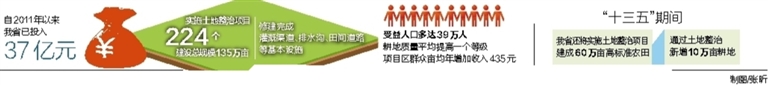据了解,自2011年以来,我省共投入37亿元进行土地整治,惠及39万群众。“十三五”期间,我省还将通过实施土地整治项目建成60万亩高标准农田,并加大补充耕地力度,通过土地整治新增耕地10万亩。