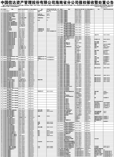 中国信达资产管理股份有限公司海南省分公司债权催收暨处置公告