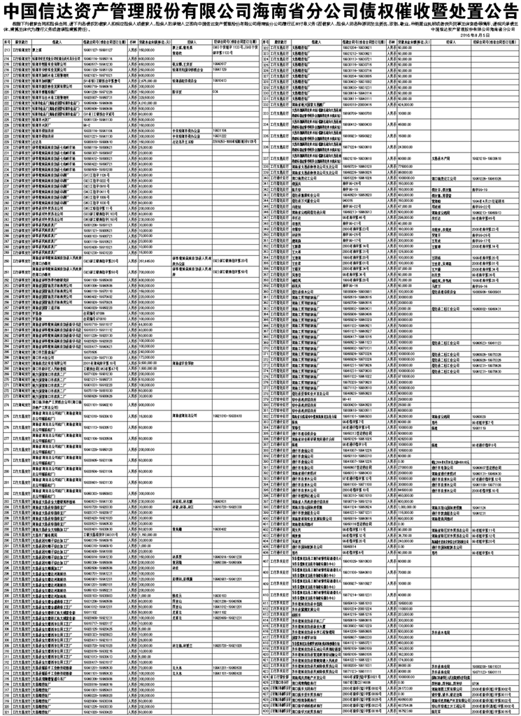 根据下列借款合同和担保合同,请下列各债权的借款人和相应担保人或借款人、担保人的承继人立即向中国信达资产管理股份有限公司海南省分公司履行还本付息义务(若借款人、担保人因各种原因发生更名、改制、歇业、吊销营业执照或者丧失民事主体资格等情形,请相关承债主体、清算主体代为履行义务或者承担清算责任)。 中国信达资产管理股份有限公司海南省分公司 2016年8月5日