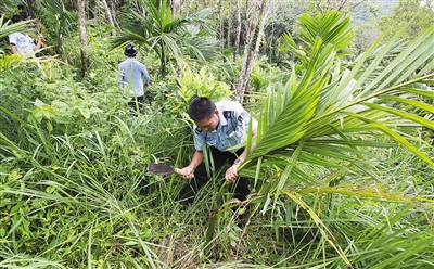“你看,这株槟榔苗种下以后,他们就把旁边树的树皮剥下一圈,让树慢慢枯死,然后再砍掉,从外围看,这片林子还是郁郁葱葱,根本看不出来里面的原生林已经被一点点蚕食、套种成槟榔树了。”三亚市森林公安局抱龙林区派出所所长赵廷琼,指着原生林木遮蔽下的一株槟榔苗说道。
