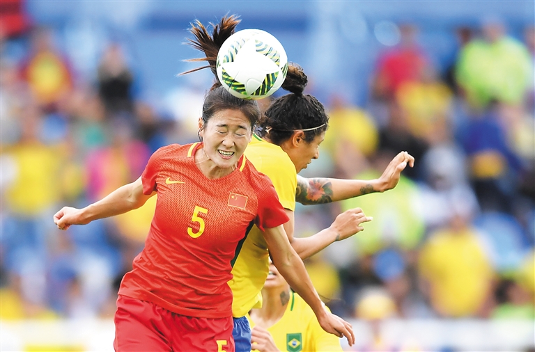 北京时间8月3日凌晨,在里约热内卢奥林匹克体育场进行的奥运会女足小组赛首轮比赛中,中国队以0:3脆败给东道主巴西队。图为中国队球员吴海燕(前)与对手争顶。 新华社发