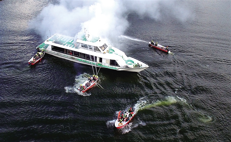 当天,演练现场模拟“有人被困岛上”、“游轮着火,有人跳水了”等紧急情况,海南省公安消防总队接到应急救援命令后,第一时间启动应急救援预案,调集足够警力和有效装备赶赴现场,展开生死大营救。