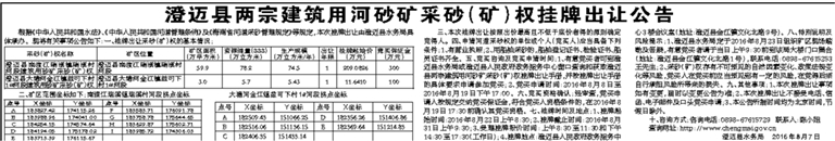 澄迈县两宗建筑用河砂矿采砂(矿)权挂牌出让公告