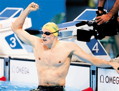 澳大利亚队女子4×100米自由泳接力选手手牵手围在一起庆祝夺冠。 (本版图片由新华社发)