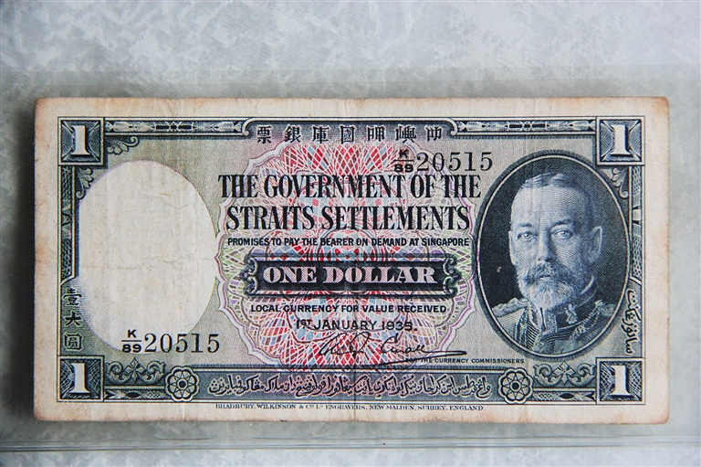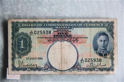 1935年马来亚发行的一元纸币,正面正上方为一行中文“叻嶼呷国库银票”,左下角有3个手写体的汉字——“壹大圆”;纸币左侧还有一片留白的位置,对着光线一照,里面有一个老虎头的暗纹水印。