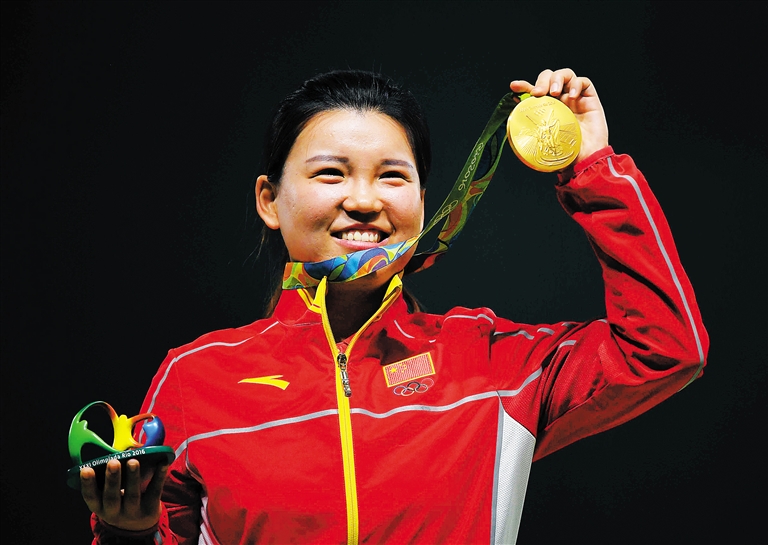 8月7日,张梦雪在颁奖仪式上展示金牌。当日,在2016年里约奥运会射击女子10米气手枪决赛中,中国选手张梦雪以199.4环的成绩夺得金牌,为中国代表团摘得本届奥运会首金。 新华社记者 韩瑜庆 摄 (更多奥运报道见A10-A11版)