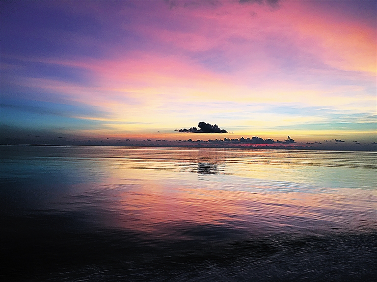 彭子娥说,照片拍摄于今年7月24日,当时自己正在永乐群岛附近海域工作,在台风“银河”来临前,平静海面宛如明镜,波光映彩霞,五光十色,恍若置身于仙境中。