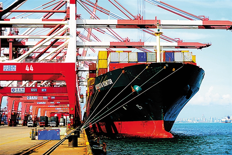 8月8日,在山东青岛港外贸集装箱码头,班轮在装卸集装箱。 海关总署8日发布数据,前7个月我国进出口总值为13.21万亿元人民币,同比下降3%。 新华社发(俞方平 摄)