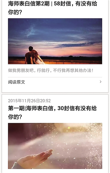 爱情是个永恒的话题,而之前海师并没有此类型的公众号,于是海师盒子抓住了“匿名表白信”这一亮点,一下子吸引了很多人的目光。海师盒子上设有专门的表白专栏,在这里留言之后,后台人员通过软件整理发出,就组成了大家经常能看到的表白信。