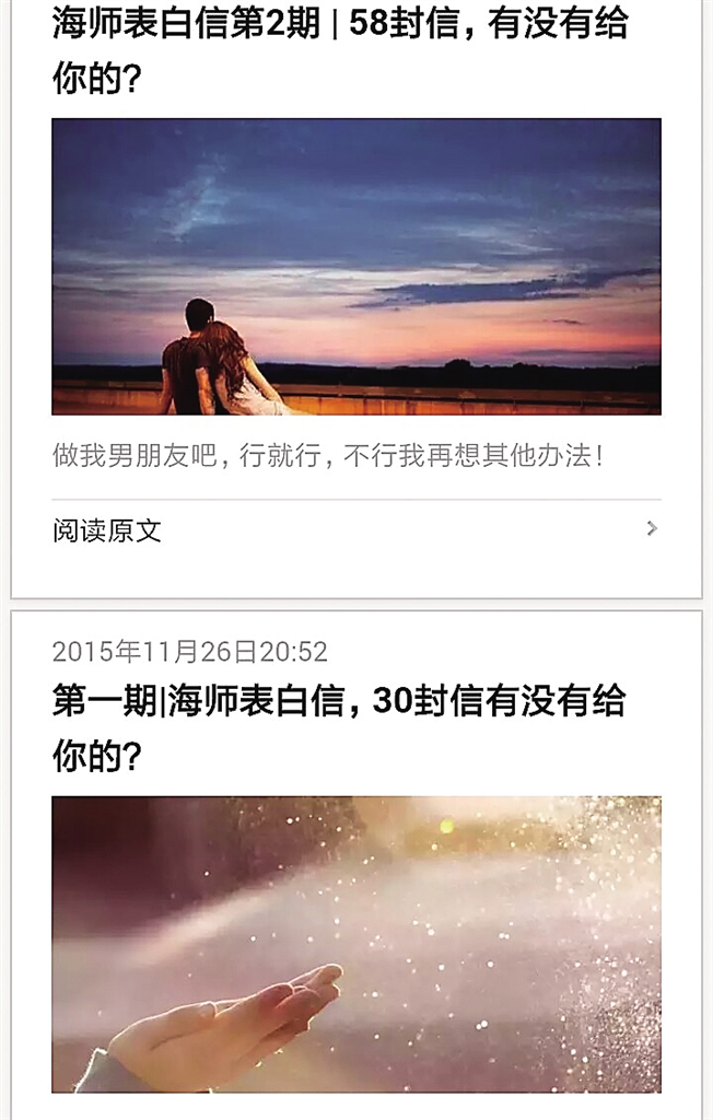 “ToXXX,喜欢和你虚度光阴。”这是海师盒子微信公众号第74期内容64封表白信的其中之一,短短64段情话达到了5621次的阅读量,这个与爱情有关的微信公众号从2015年11月21日开通至今,粉丝量已经增加至10000+。