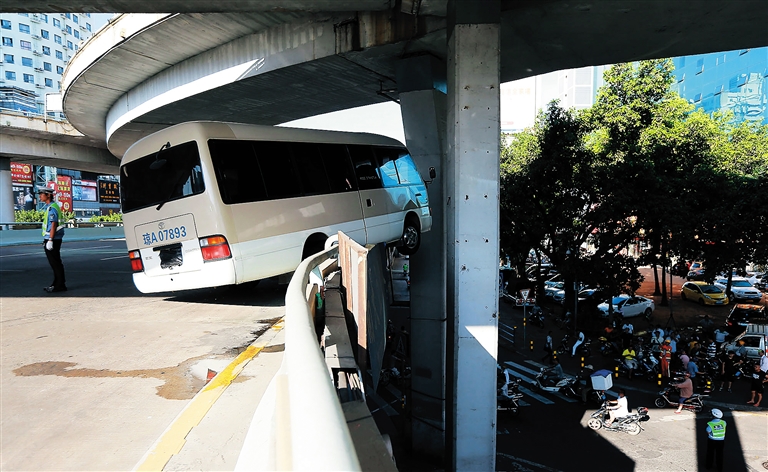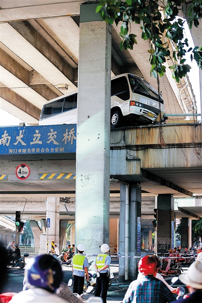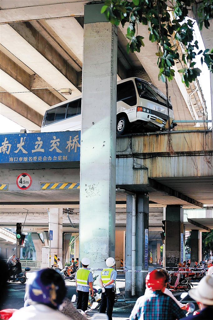 据悉,事发时,这辆中巴车从龙昆南路往海秀东路方向转弯,一辆公交车在桥上由西向东行驶,两车避让不及发生剐蹭,中巴车急打方向后冲上了大桥护栏。当时中巴车上只有驾驶员,公交车上有多名乘客,但均没有受伤。