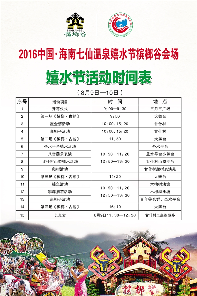 据了解,活动期间,槟榔谷景区将举办盛大开幕式:“取圣水”“敬七仙”“祈愿”等精彩环节充分展示嬉水节“水”的主题。同时,在景区嬉水广场,黎族长老和美丽的七仙女盛邀广大游客一起嬉水狂欢,体验八音器乐表演、爬树比赛、黎家传统长桌宴、捕鱼比赛、攀藤摘花、赶椰子等欢快喜庆的黎族民俗互动项目;同时,还将举办“琼台两岸一家亲”传统体育竞技比赛暨篝火晚会,吸引八方来客前来体验“黎”元素的文化内涵。