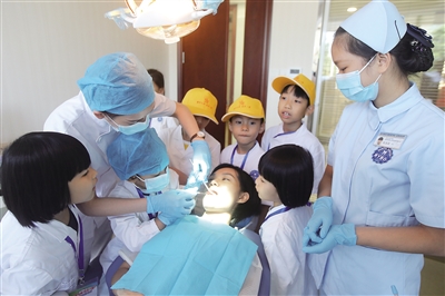 小学生们跟随着口腔医生学习口腔知识和体验口腔治疗流程,当了回“小牙医”。 本报记者 张茂 实习生 吴英艳 摄