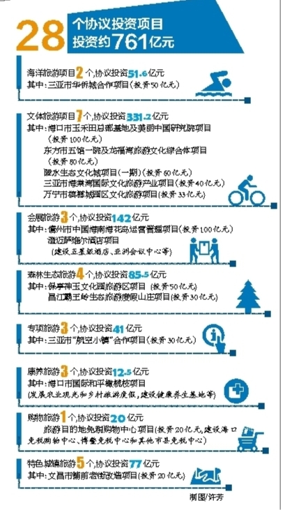 此次签约的28个协议投资项目涉及海洋旅游、文体旅游、会展旅游、森林生态旅游、专项旅游、康养旅游、购物旅游、特色城镇旅游等领域,分布在全岛10余个市县,包括海口、东方、三亚、儋州、陵水、保亭、万宁、昌江、文昌、澄迈、琼海、五指山等,有望有效推动多地旅游业发展。
