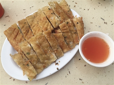 那醋,是用蒜蓉酱、白醋、白糖、白开水和金桔汁调制而成,微酸中带有甘甜。阿开说,不少人以为,酸甜醋的红色是加了色素,但海南美食最讲究原味,加了色素的醋在口感上会有略微的涩,一尝就能尝出来。醋里的红,是蒜蓉酱被稀释后的颜色,酸甜的口感,还能中和烙饼原先的油腻,“解腻多食,自然健康。”