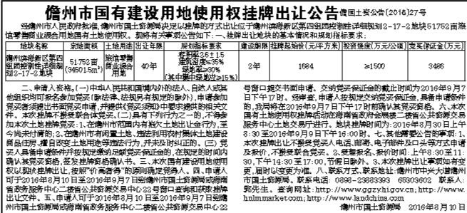 儋州市国有建设用地使用权挂牌出让公告