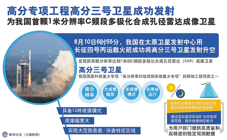 科学家相信,高分三号将在海洋、减灾、水利、气象等多个领域“一展身手”,为海洋监视监测、陆地环境资源监测和应急防灾减灾提供重要技术支撑,使天基遥感跨入全天时、全天候、定量化、米级的应用时代。记者 白国龙 余晓洁 杨维汉