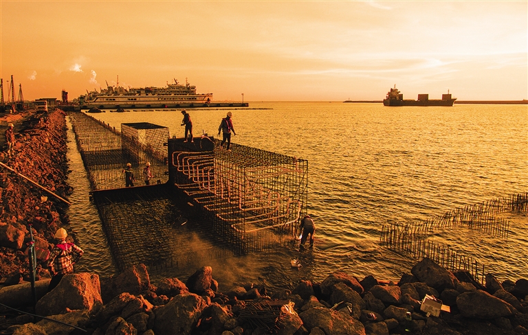 8月9日,海口新海港客货滚装码头二期工程进展顺利,目前进入码头沉箱安装和胸墙作业,预计年底5个泊位将投入使用。据悉,截至目前我省18个重点交通项目投资突破56亿元,预计年内将完成百亿元投资。本报记者 王凯 摄