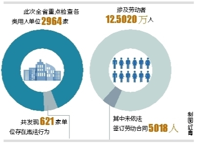据专项检查组透露,此次全省重点检查各类用人单位2964家,涉及劳动者12.5020万人,其中未依法签订劳动合同5018人。共发现621家单位存在违法行为,发现违反最低工资规定和拖欠工资案件317件,涉及金额266万元,未依法参加社会保险登记113件,未依法缴纳社会保险费279件,涉及金额294万元。