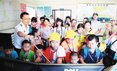 图为参加首期2016年青少年水上安全航海体验海事夏令营的孩子们在参观琼州海峡VTS中心。