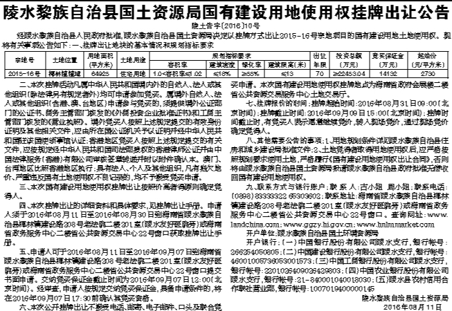 陵水黎族自治县国土资源局国有建设用地使用权挂牌出让公告