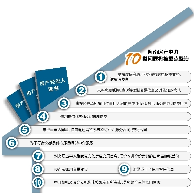 今年,我省将大力开展房地产中介市场的清理与规范,要求对目前房地产中介交易市场存在的发布虚假房源、挪用或侵占交易资金、强制提供代办服务等10大乱象行为进行整治,并将配合协助全国统一开展房地产经纪人协理和房地产经纪专业人员职业资格考试,规范管理房地产中介从业人员。