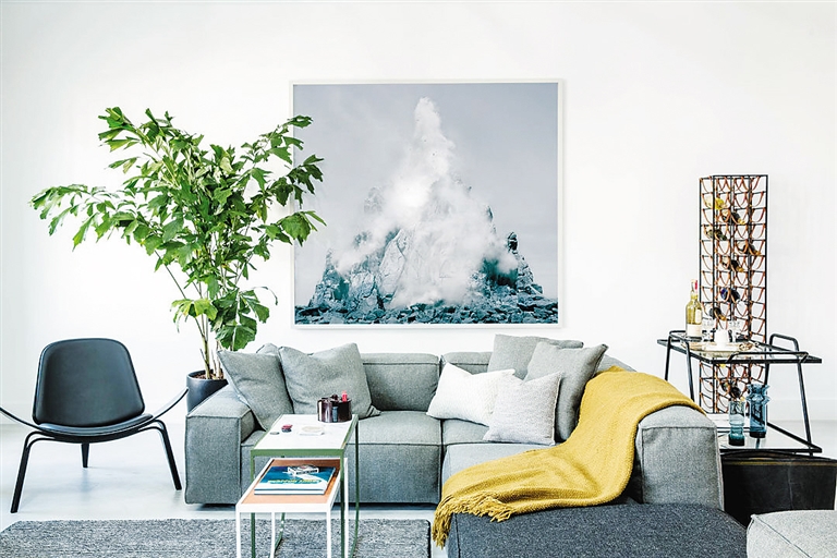 为了避免沙发区域墙面单调,可以选择在墙面上展示充满现代感的装饰画,让沙发区域成为视觉焦点。