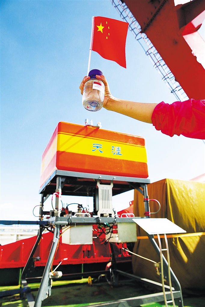 科考队员张维佳满脸微笑,用一个覆着红布的托盘托着拳头大小、瓶身透明的一瓶水,向到场迎接的科学家和政府领导们展示。瓶里的水在阳光照耀下异样清澈,瓶身的标签写着:万米海水。