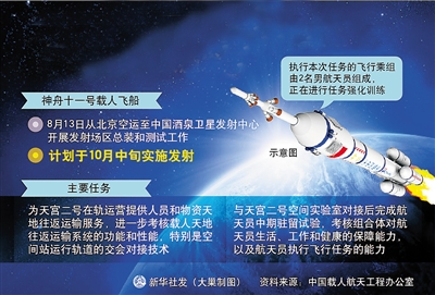神舟十一号载人飞船计划于10月中旬实施发射。目前,发射场设施设备状态良好,各项准备工作正按计划有序进行。