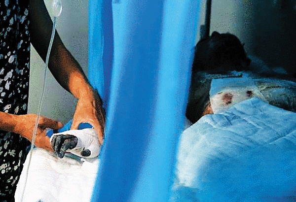 杨冬玲浑身缠着纱布一动不动地躺在病床上,裸露的皮肤呈现出碳色,被单上的血水印记清晰可见。母亲和妹妹帮她换药,每触碰一下伤口,她都会发出痛苦的呻吟。