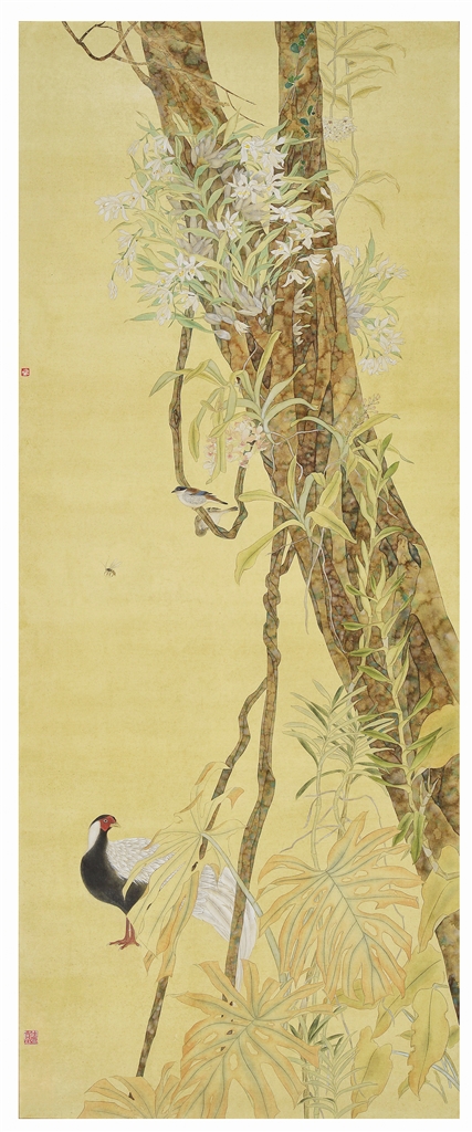 关山月美术馆研究员、复旦大学博士庄程恒就以《秘境》一画为例,认为黄祎天虽以寄生在老树上的石斛兰为主体,但为了突出热带雨林的丰美与神秘,还描绘了藤蔓、蕨类等南国异草,点缀了白鹇、斑鸠、蓝尾雀等热带珍禽,在表现手法上勾勒设色与撞水、撞粉并用。他分析,“这幅作品的创作动因,正来自黄祎天对枯木上寄生的植物强大生命力的叹服,在她看来,是寄生的兰花给了枯木第二次生命。”