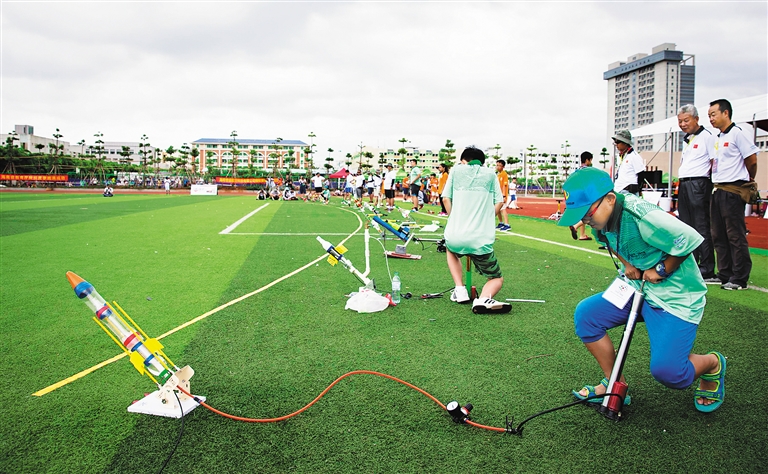 为期三天的第十八届“飞向北京—飞向太空”全国青少年航空航天模型教育竞赛总决赛于8月13日在海口市闭幕。共有包括香港代表队在内的44支代表队参加,1300多名青少年选手参与角逐。本报记者 宋国强 摄
