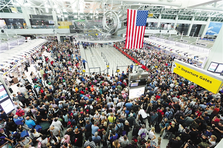 8月15日凌晨,在美国纽约肯尼迪国际机场,乘客在一号航站楼等待安检重新开放。 纽约肯尼迪国际机场部分航站楼14日晚因发生疑似枪击事件而紧急疏散人员,航班大面积延误或取消。 新华社记者 王迎 摄