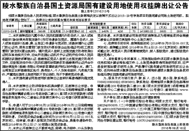陵水黎族自治县国土资源局国有建设用地使用权挂牌出让公告