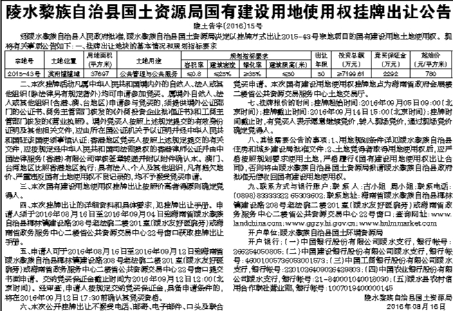 陵水黎族自治县国土资源局国有建设用地使用权挂牌出让公告