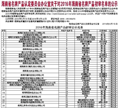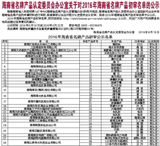 海南省名牌产品认定委员会办公室关于对2016年海南省名牌产品初审名单的公示