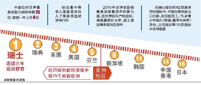 在评估高校水平、科学出版物和国际专利申请量的顶层指标“创新质量”中,日本、美国、英国和德国排名前四,中国名列第17位,成为中等收入经济体的领头羊,其次是印度(25位)和巴西(27位)。