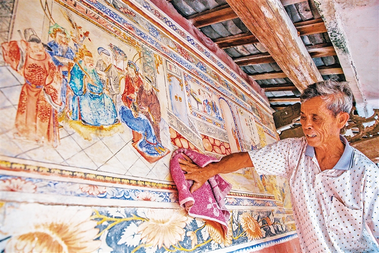 据了解,道盖村神王祖庙始建于明代,距今500多年,目前光绪年间绘制的18幅壁画保存较好。每幅长约1.6米、高约1米。记者发现这些壁画以人物画为主要形式,历史典故和宗族故事为题材内容。原省青年美术家协会秘书长张昌赋说,不论是人物造型、风格技巧还是设色敷彩,都达到了较高水平,这是海南少有的艺术价值较高、保存较为完整的堂庙壁画。本报记者 张茂 摄