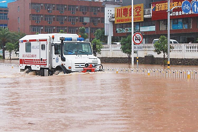由于海口市内多路段积水,海口市120出动全省唯一一辆乌尼莫克涉水急救车开展医疗救援。截至8月18日17时,乌尼莫克涉水救护车出诊5次,地点涵盖白水塘、海垦路、龙华路、国贸、新港等严重积水路段,共接诊患者5名。 海口120急救中心供图