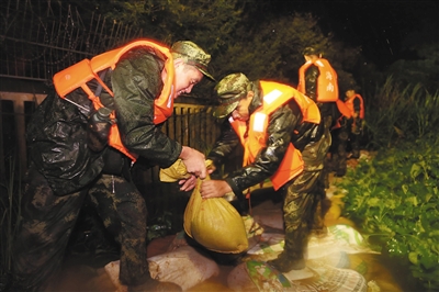 8月18日,海口市美兰区大顶村低洼地积水严重,部分地段出现积水倒灌现象,海南东环高铁美兰轨道线路出现险情。武警海南省总队迅速组织200余名兵力雨夜赶赴一线抢险救灾。图为武警战士正用沙袋堆起“堤坝”。 本报记者 张茂 通讯员 杨瑞明 摄
