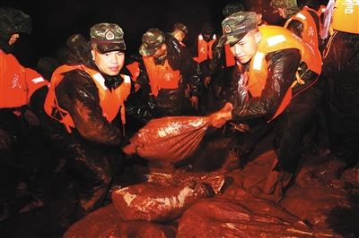 8月19日凌晨,临高县抱美一水库受强降雨影响库区水量骤增,水面位置距土坝顶端仅40厘米,随时可能出现洪水漫顶的危险。武警海南省总队出动100余名兵力夜驰100公里赶赴现场救援。官兵们连续奋战8个小时,装运9000余个沙包,将长达50余米的土坝整体垒高近3米,水库险情得到有效控制。图为8月19日凌晨3时,武警官兵在抱美一水库顶部进行堤坝加固。 本报记者 李佳飞 特约记者 吴孝俊/文 本报记者 张茂 通讯员 杨瑞明/图