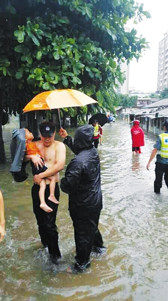 曾德宁本来是把帽子给孩子戴上,可帽子已经落水湿透。他又将外套脱下,但仍是湿透的。最后,他干脆脱下贴身的制服蒙在孩子头上。当曾德宁从水里抱出孩子时,市民刚好抓拍到这个场景,大家纷纷为这份洪水中的温情点赞。