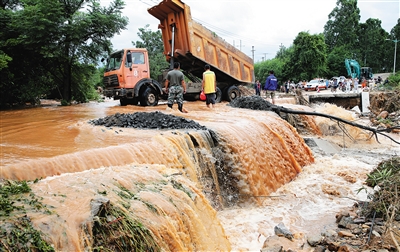 19日18时许,雨早已停歇。“靠左,再靠左一点,好,往后倒。”昌江县石碌镇通往王下乡的道路上,县公路局工作人员吴刚指挥着运砂车,将车上满载的砂石倾倒在被冲毁的缺口处。黑色砂石倾倒中,从霸王岭中蜿蜒而出的黄色水龙奔腾不歇,一波接着一波,冲击着道路与抢修人员的心。