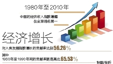 报告认为,快速的经济增长对中国的人类发展进步起到非常重要的作用。1980年至2010年的三十年间,中国的经济收入指数增幅在全球排名第一,经济增长对人类发展指数增长的贡献率达到56.26%,其中1980年至1990年间的贡献率更是高达65.53%。