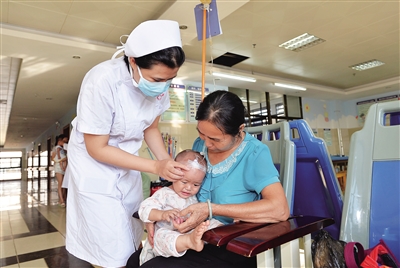 8月22日,临高县人民医院儿科门诊医护人员正在为患儿进行诊疗。目前医院已经通水通电,各科室恢复正常。 据悉,医院被洪水围困期间,医护人员坚守在岗位上为患者提供医疗服务。