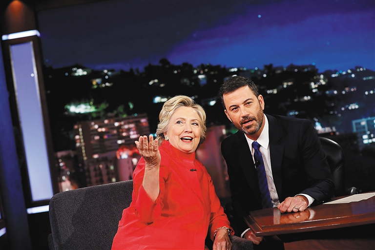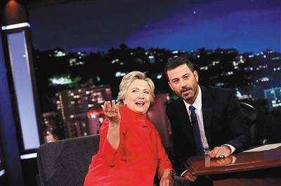 8月22日,希拉里·克林顿(左)在美国加利福尼亚州洛杉矶参加吉米·基梅尔脱口秀节目录制。 美国国务院8月22日证实,美国联邦调查局在调查民主党总统候选人希拉里·克林顿“邮件门”事件时发现了另外约1.5万封未被希拉里团队上交国务院的邮件,国务院目前正在就邮件内容进行审查,为公布这批邮件中涉及公务内容做准备。 新华社/路透