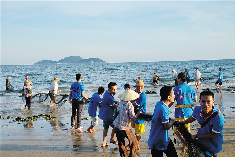不仅是高中生,成年人对拉网捕鱼也极其热爱。这一项考验着体力、协作能力的活动,总让人能收获满满。在万宁的乌海,赶海拉网也是许多集体外出活动的选择。